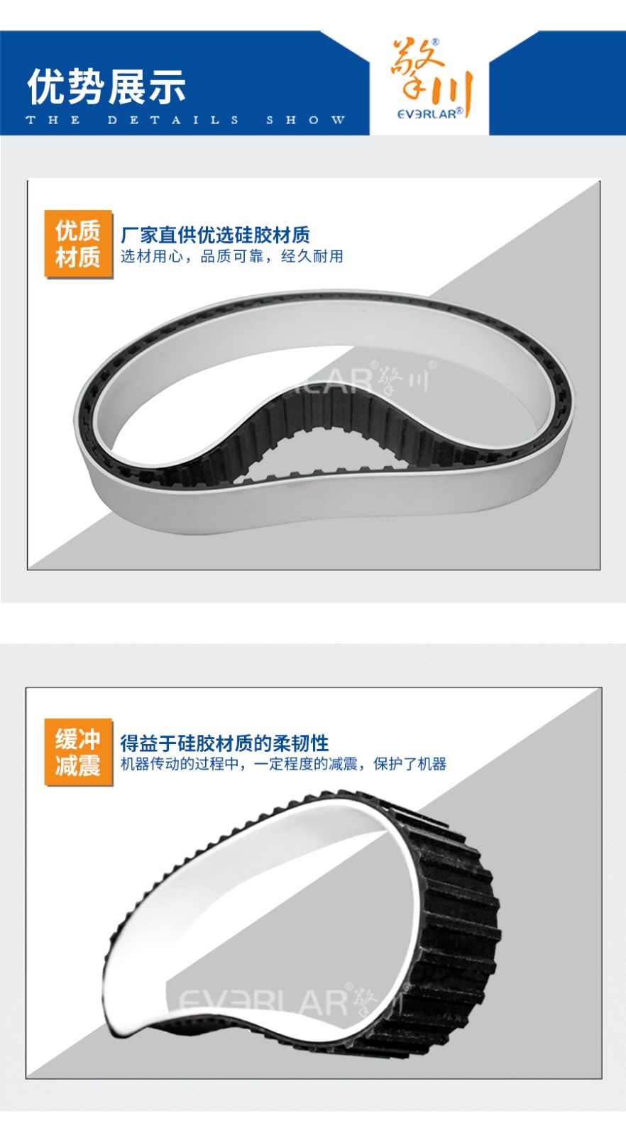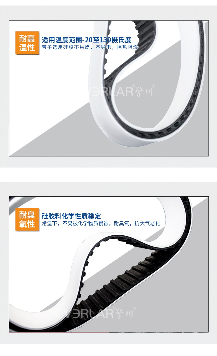 本樣品為同步帶加硅膠,同步帶為基帶,齒面加硅膠,我少有的皮帶工藝設計。同步帶表面的耐高溫硅膠耐受溫度可達-20至130攝氏度,使用溫度廣泛,隔熱阻燃,不導熱,不導電,具有很高的電阻率,同時對靜電具有很好抵抗性,對產品起到了保護作用。