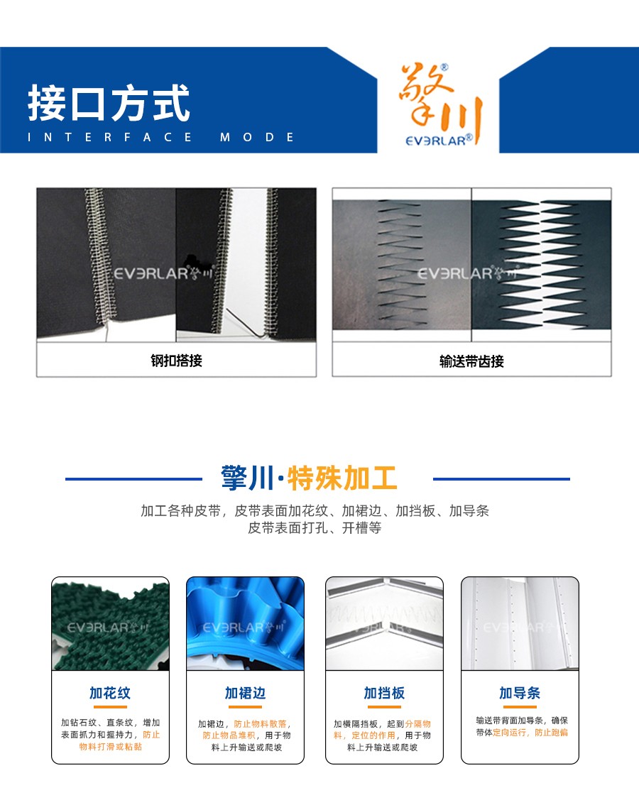 特種加工 | 底帶選擇—橡膠同步帶; 開槽加工—底帶開槽的具體寬度、深度由客戶自定; 加膠加工—膠的顏色、材質(橡膠/PU膠)、厚度由客戶自定; 打孔加工—孔的大小由客戶自定; 表面深孔加工——大小、方向、高度由客戶自定。 |