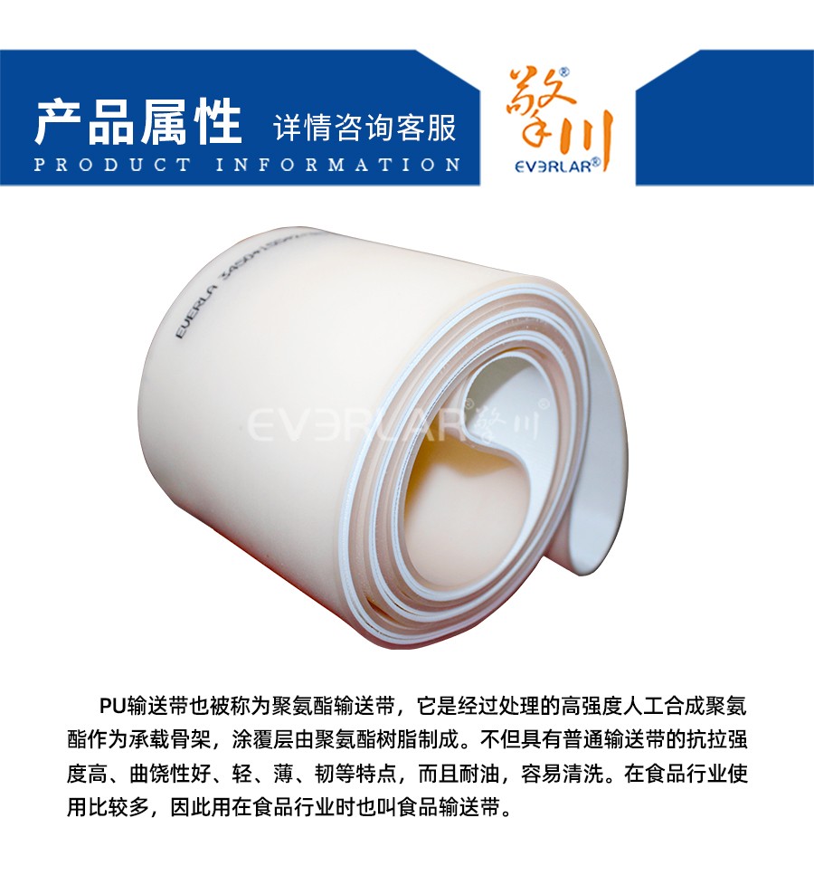 PU輸送帶也被稱為聚氨酯輸送帶,它是經(jīng)過(guò)處理的高強(qiáng)度人工合成聚氨酯作為承載骨架,涂覆層由聚氨酯樹(shù)脂制成。不但具有普通輸送帶的抗拉強(qiáng)度高、曲饒性好、輕、薄、韌等特點(diǎn),而且耐油,容易清洗。在食品行業(yè)使用比較多,因此用在食品行業(yè)時(shí)也叫食品輸送帶。