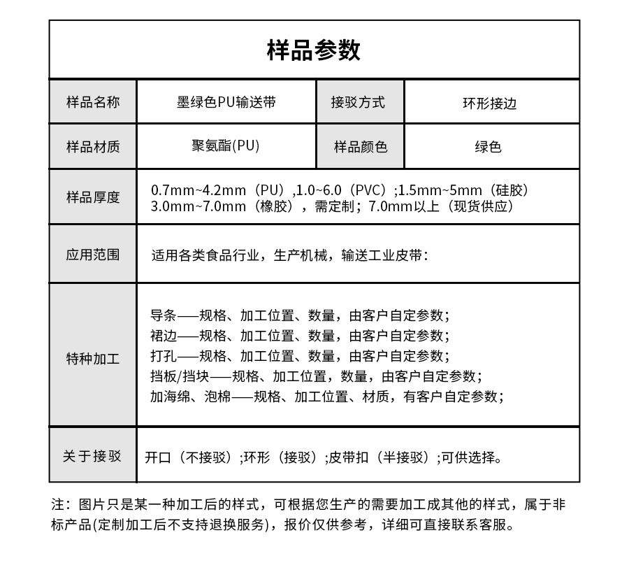 樣品名稱 | 墨綠色PU輸送帶 | 接駁方式 | 環形接邊 |