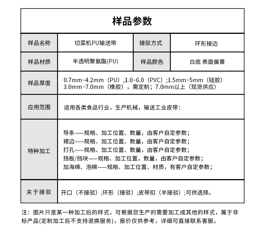 樣品名稱 | 切菜機(jī)PU輸送帶 | 接駁方式 | 環(huán)形接邊 |