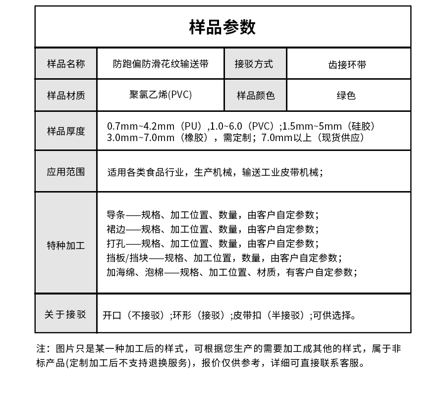 樣品名稱 | 防跑偏防滑花紋輸送帶 | 接駁方式 | 齒接環帶 |