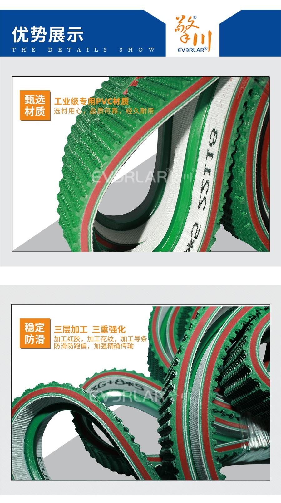 本樣品為防跑偏防滑花紋輸送帶,采用了PVC材質,根據客戶行業需求加工了紅膠,降低材料硬度,在紅膠表面設計花紋提高柔韌性,增強防滑耐用的效果。底部中心設計導條,精準傳送不跑偏專用定制設計加工,高度匹配客戶使用。