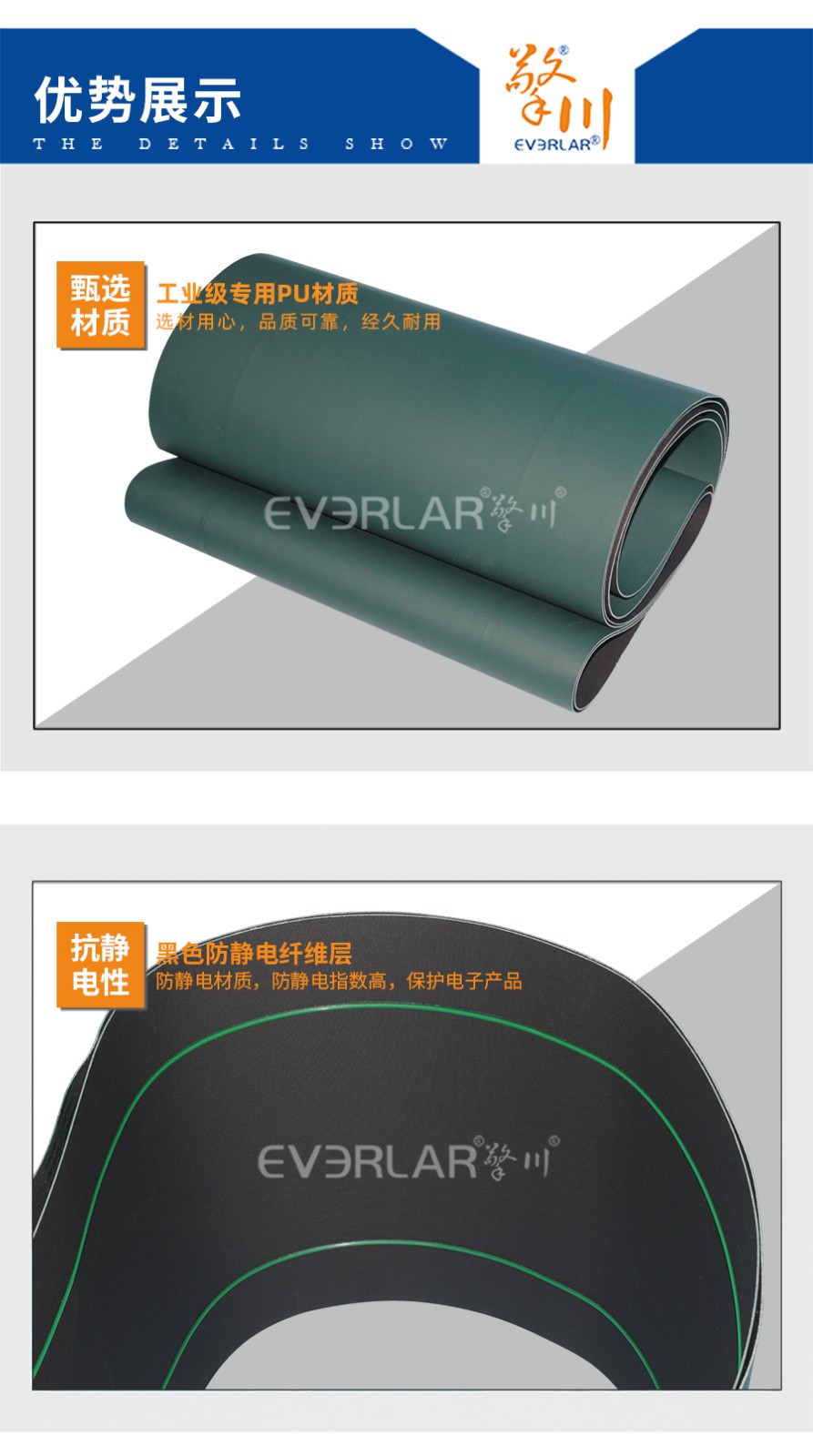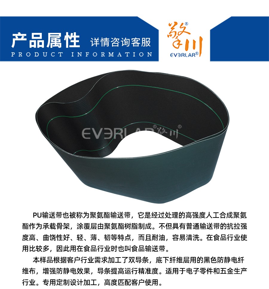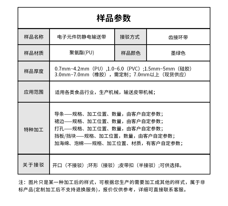 樣品名稱 | 電子元件防靜電PU輸送帶 | 接駁方式 | 齒接環(huán)帶 |