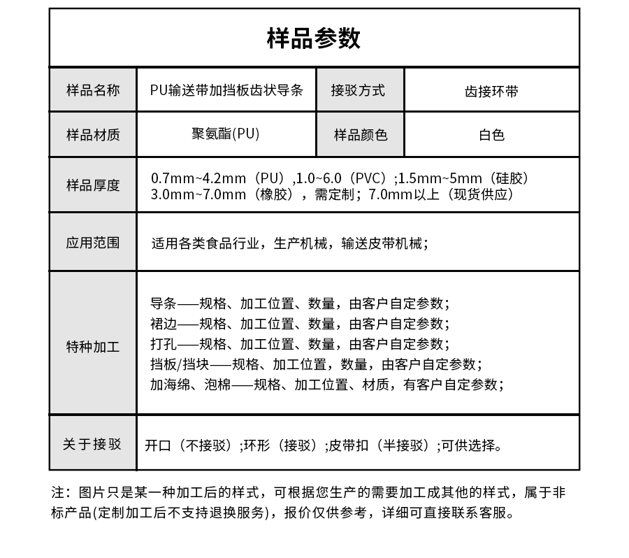 樣品名稱 | 白色PU輸送帶加擋板齒狀導條 | 接駁方式 | 齒接環帶 |