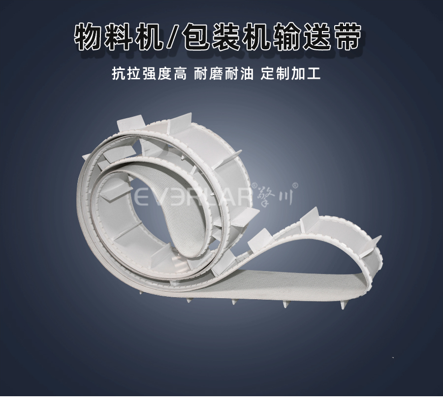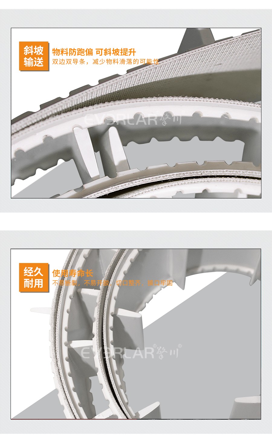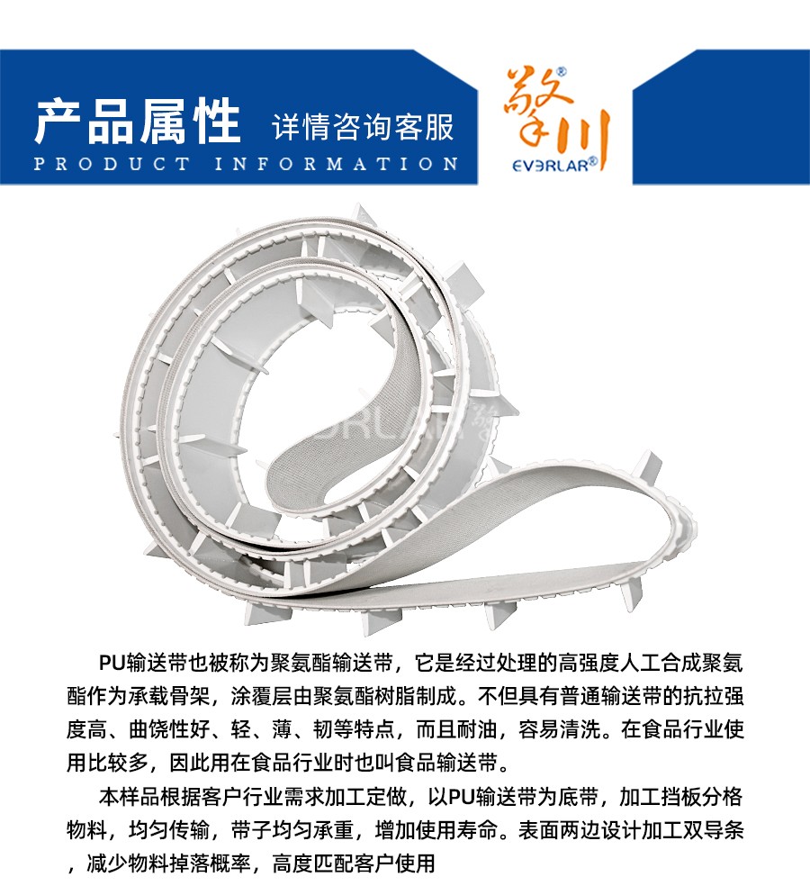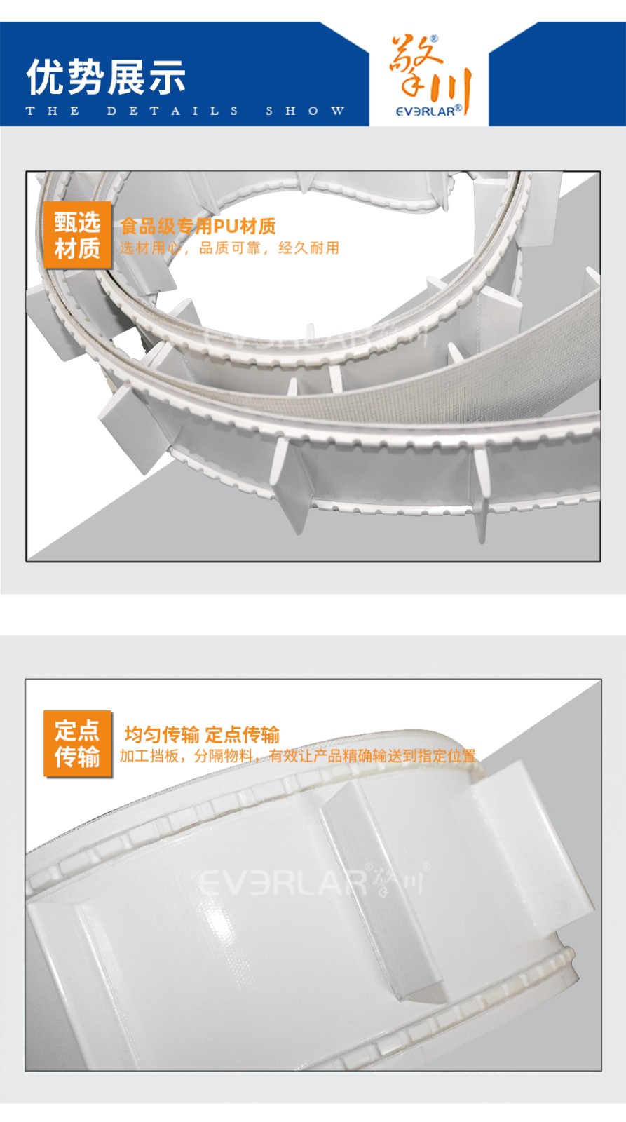 本樣品根據(jù)客戶行業(yè)需求加工定做,以PU輸送帶為底帶,加工擋板分格物料,均勻傳輸,帶子均勻承重,增加使用壽命。表面兩邊設計加工雙導條,減少物料掉落概率,高度匹配客戶使用。