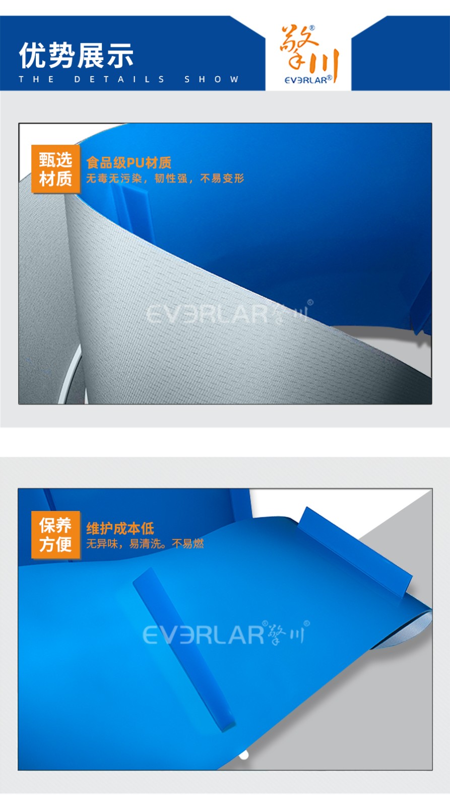 PU輸送帶也被稱為聚氨酯輸送帶,它是經過處理的高強度人工合成聚氨酯作為承載骨架,涂覆層由聚氨酯樹脂制成。不但具有普通輸送帶的抗拉強度高、曲饒性好、輕、薄、韌等特點,而且耐油,容易清洗。在食品行業使用比較多,因此用在食品行業時也叫食品輸送帶。