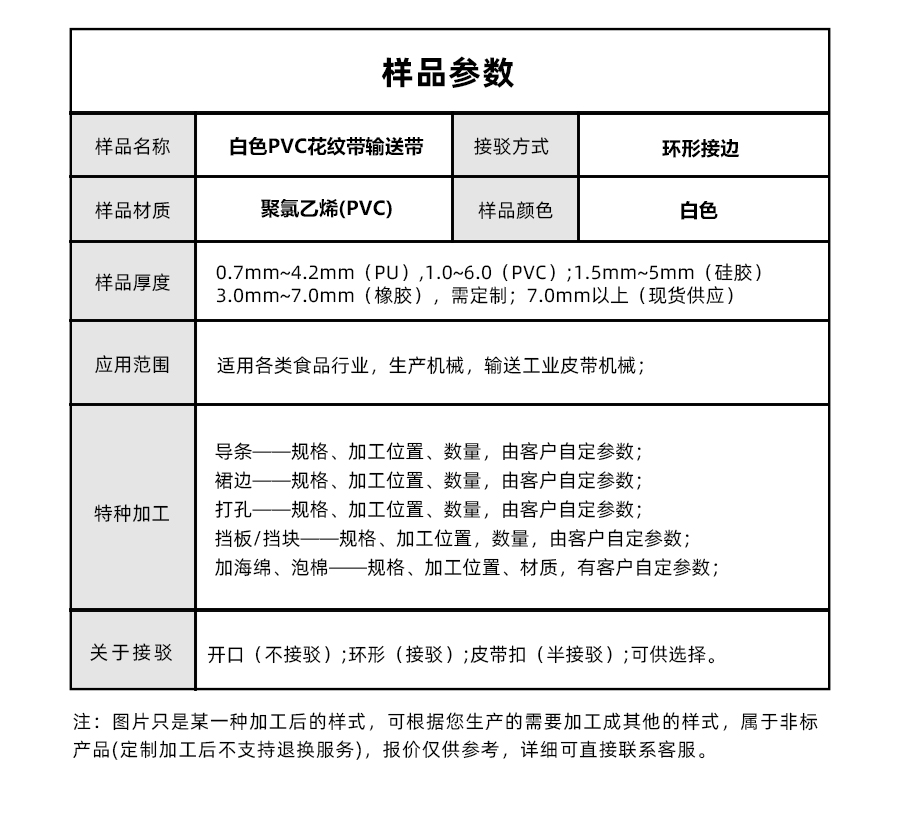 樣品名稱 | 白色PVC花紋帶輸送帶 | 接駁方式 | 環形接邊 |