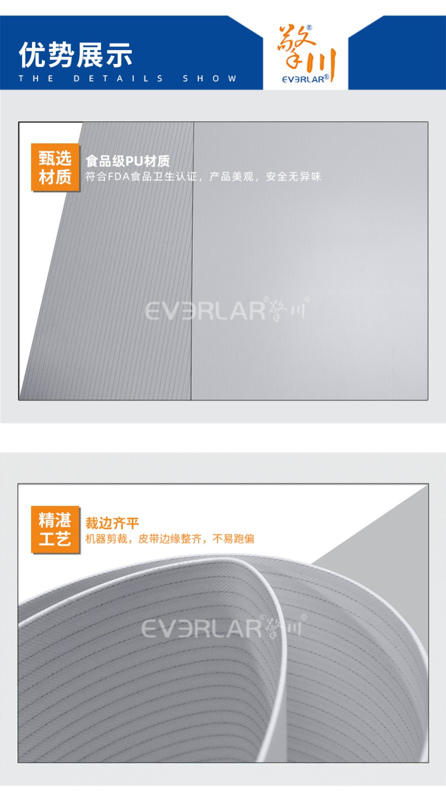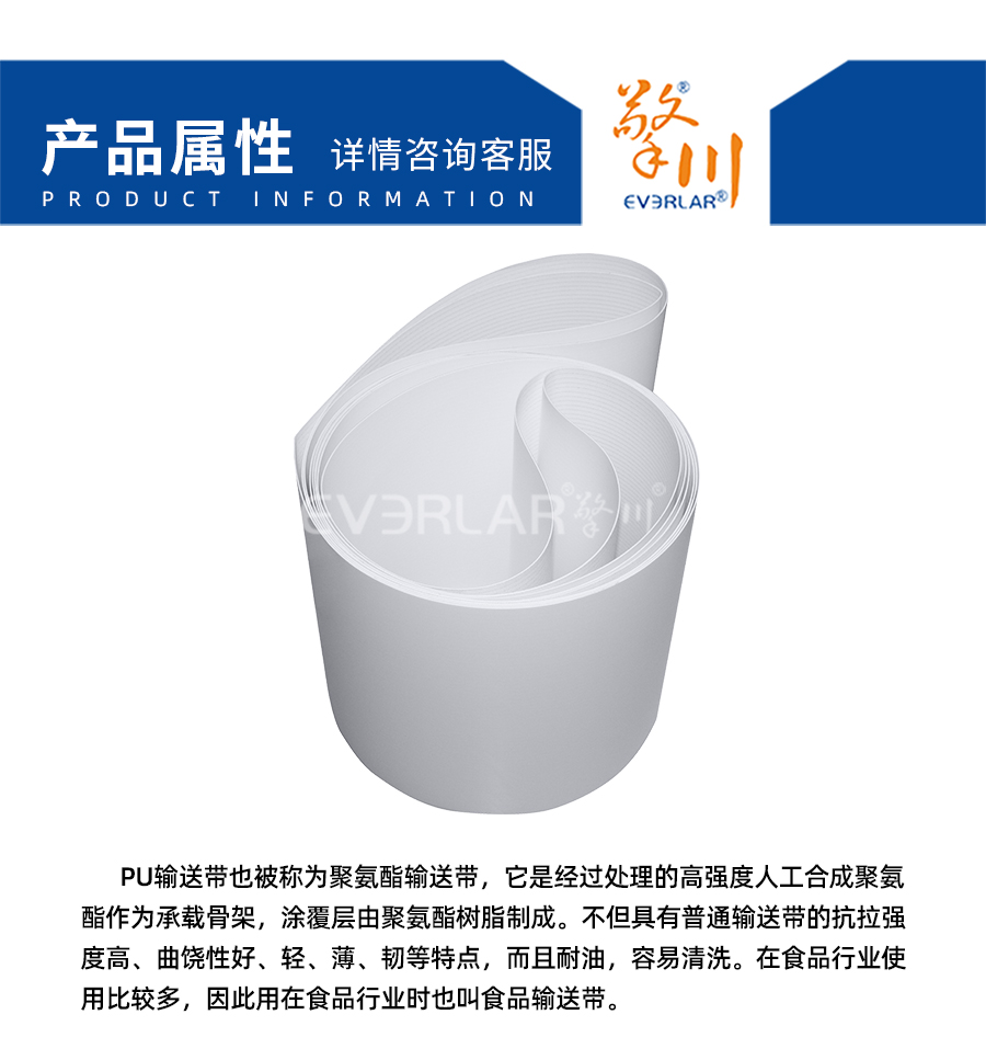 PU輸送帶也被稱為聚氨酯輸送帶,它是經過處理的高強度人工合成聚氨酯作為承載骨架,涂覆層由聚氨酯樹脂制成。不但具有普通輸送帶的抗拉強度高、曲饒性好、輕、薄、韌等特點,而且耐油,容易清洗。在食品行業使用比較多,因此用在食品行業時也叫食品輸送帶。