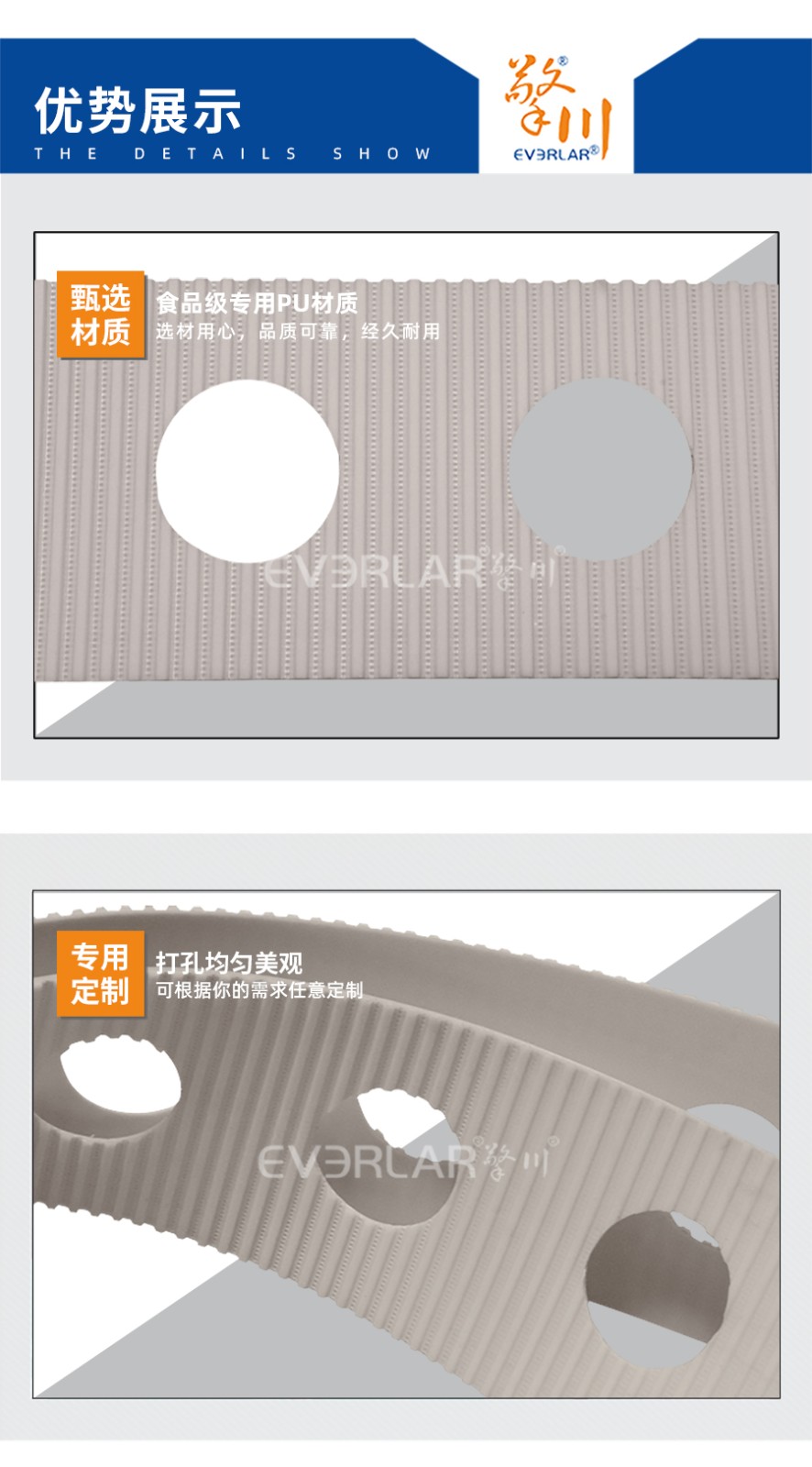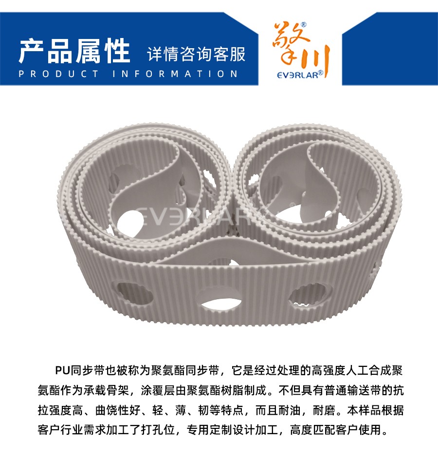 PU同步帶也被稱為聚氨酯同步帶,它是經過處理的高強度人工合成聚氨酯作為承載骨架,涂覆層由聚氨酯樹脂制成。不但具有普通輸送帶的抗拉強度高、曲饒性好、輕、薄、韌等特點,而且耐油,耐磨。本樣品根據客戶行業需求加工了打孔位,專用定制設計加工,高度匹配客戶使用。