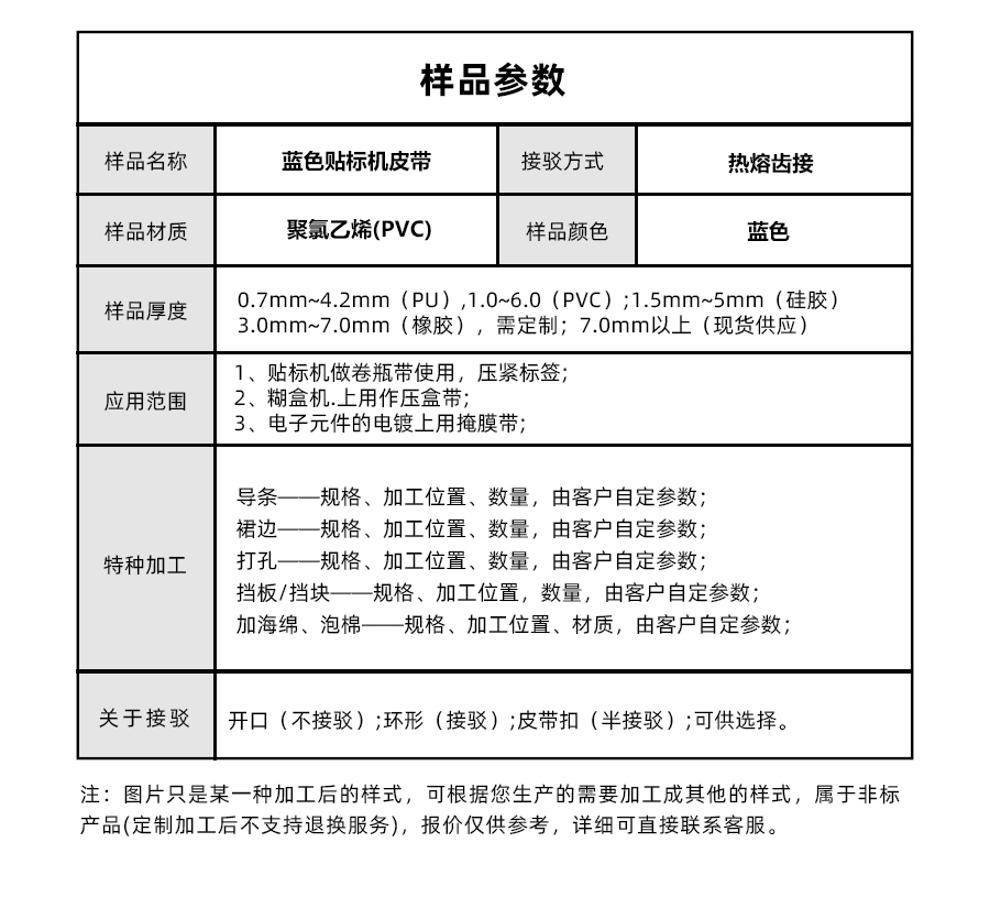 樣品名稱 | 藍色貼標機皮帶 | 接駁方式 | 熱熔齒接 |