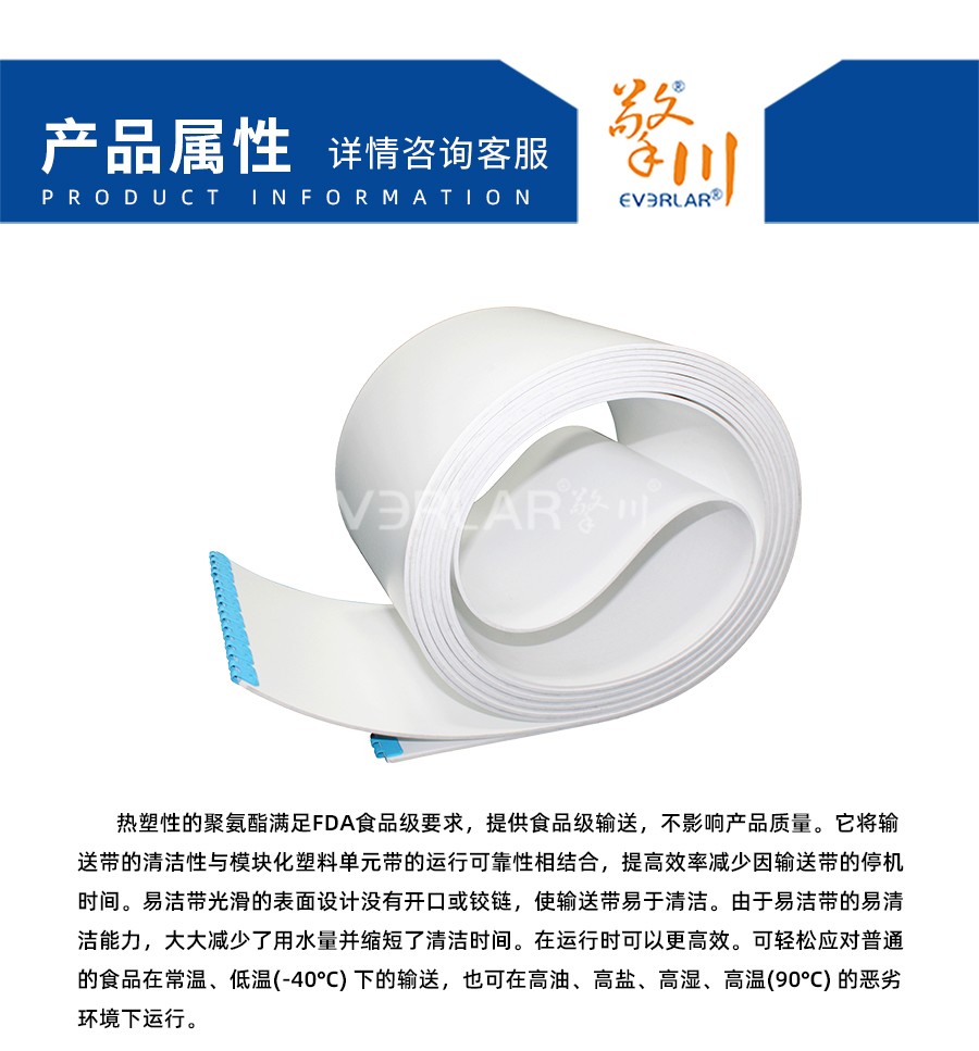 • 產品名稱:擎川everlar定制白色易潔帶加塑料接口食品輸送帶