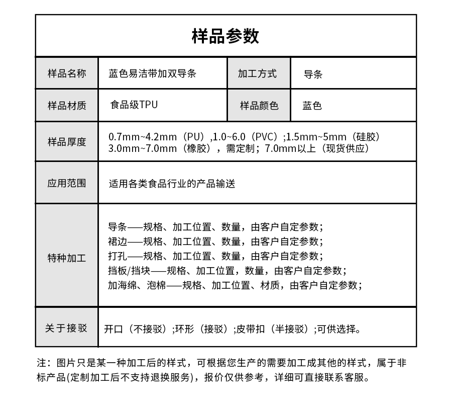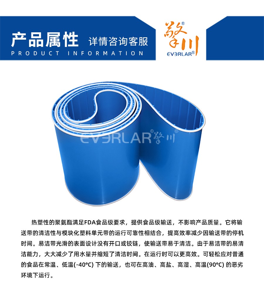 產(chǎn)品名稱:藍(lán)色易清潔帶加雙導(dǎo)條肉類機(jī)械設(shè)備皮帶