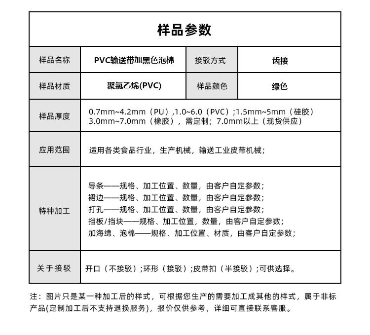 產(chǎn)品名稱:綠色PVC輸送帶加黑色泡棉耐磨耐腐蝕耐高溫工業(yè)皮帶定制
