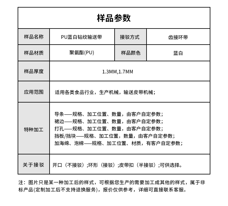 • 產品名稱:PU藍白鉆紋輸送帶耐磨耐油耐腐蝕工業皮帶定制