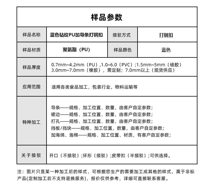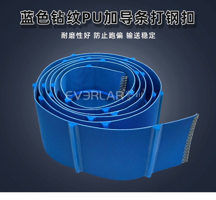 • 產品名稱:藍色鉆紋PU輸送帶加導條打鋼扣耐磨易清潔工業皮帶定制