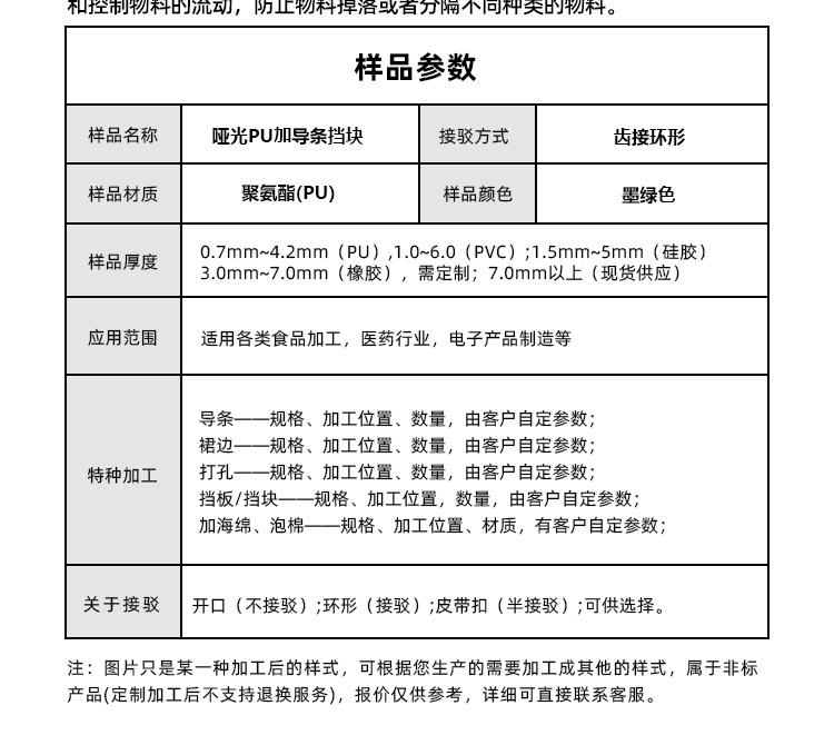 • 產品名稱:啞光PU輸送帶加導條擋板耐磨耐腐蝕耐切割工業皮帶定制
