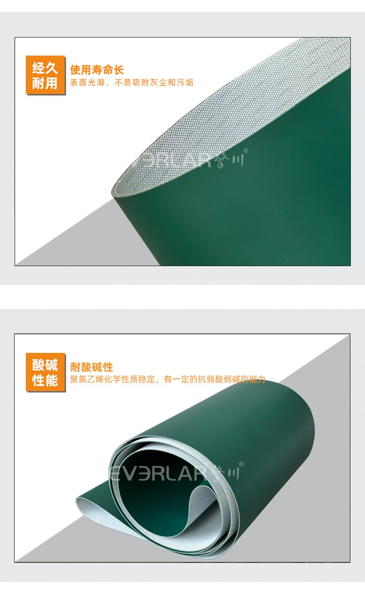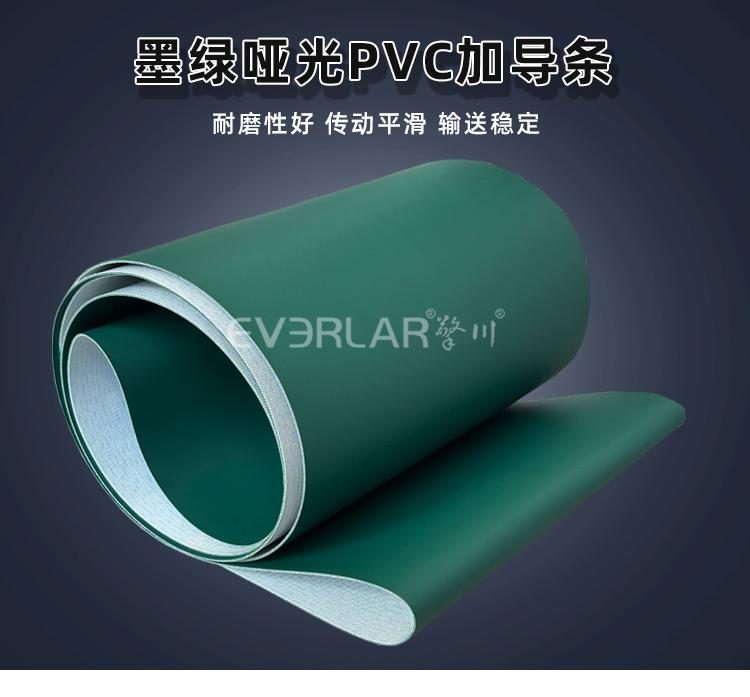 • 產品名稱:墨綠啞光PVC輸送帶加導條耐腐蝕防滑易清潔工業皮帶定制