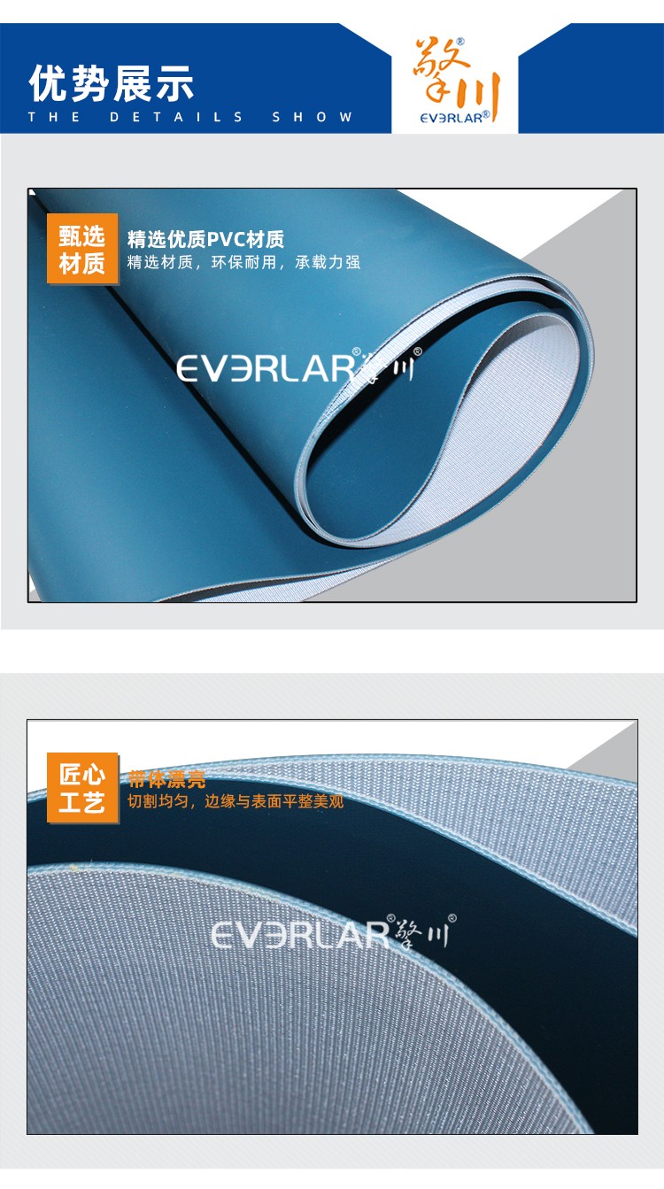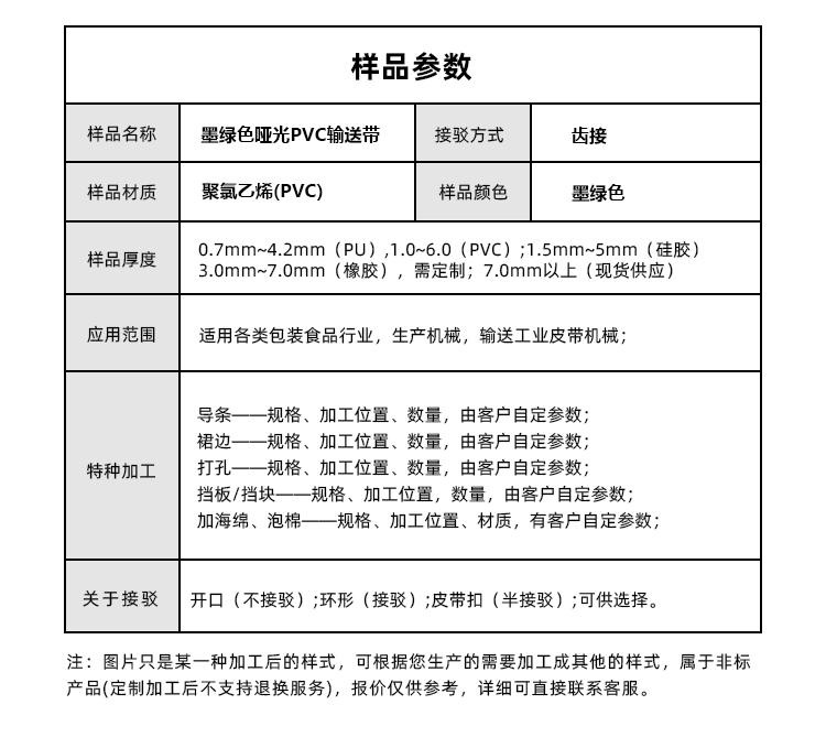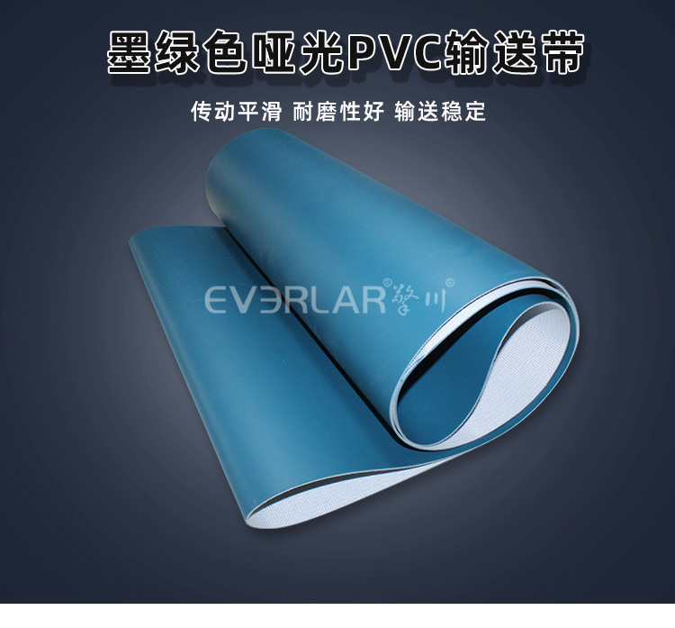 • 產(chǎn)品名稱:墨綠色啞光PVC輸送帶加導(dǎo)條耐腐蝕防滑易清潔工業(yè)皮帶定制