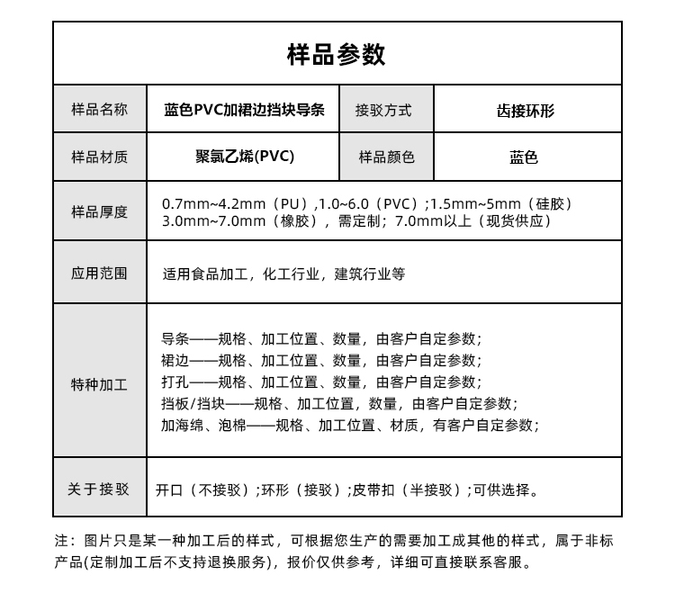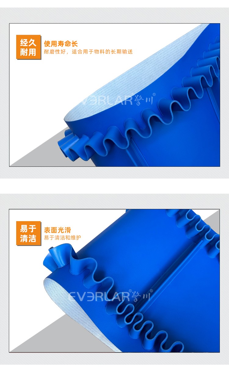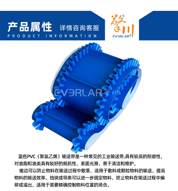 • 產品名稱:藍色PVC輸送帶加裙邊擋板導條耐磨耐油耐腐蝕工業皮帶定制