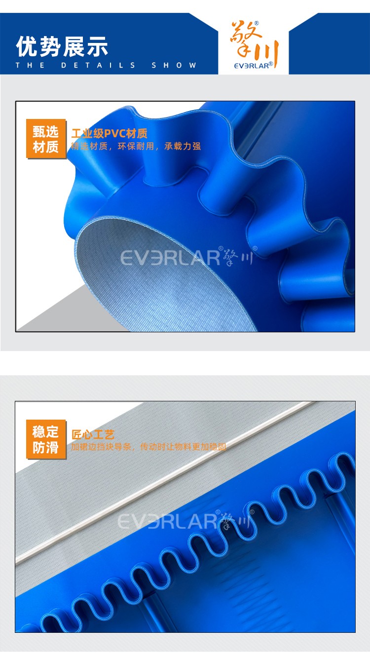 • 藍色PVC輸送帶加裙邊擋板導條耐磨耐油耐腐蝕工業皮帶定制