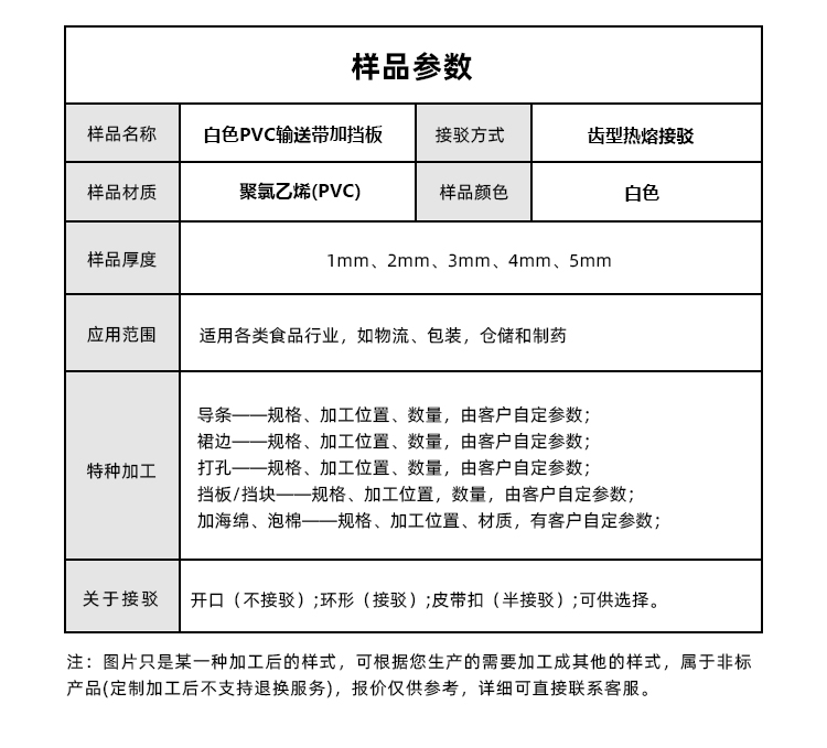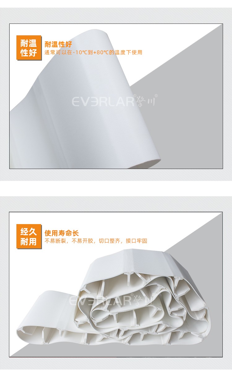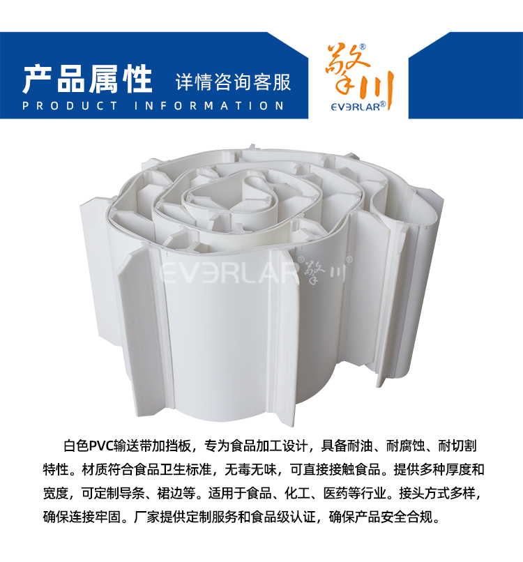 • 產品名稱:白色PVC輸送帶加擋板耐磨耐撕裂抗壓強度高工業皮帶