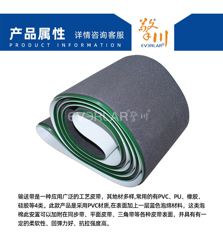 產(chǎn)品名稱: 綠色PVC輸送帶加黑色泡棉耐磨防靜電抗壓強(qiáng)度高工業(yè)皮帶