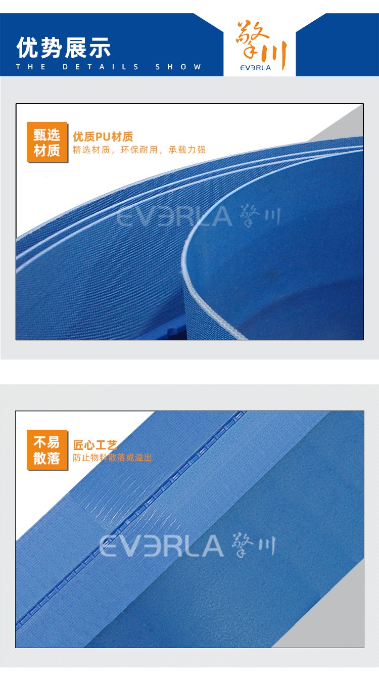 • 產品名稱:藍色PU輸送帶加導條耐磨耐油耐腐蝕工業皮帶定制
