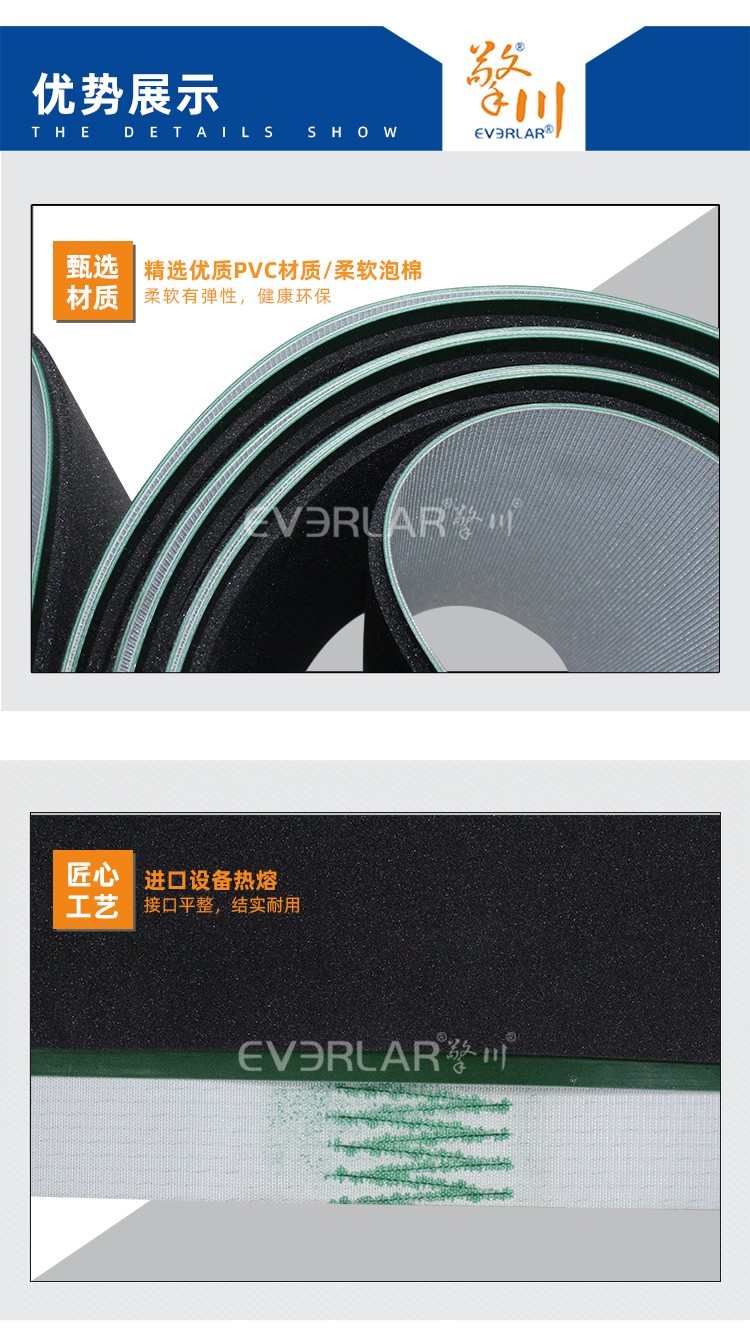 • 產品名稱:綠色PVC輸送帶加黑色泡棉耐磨耐腐蝕耐高溫工業皮帶定制
