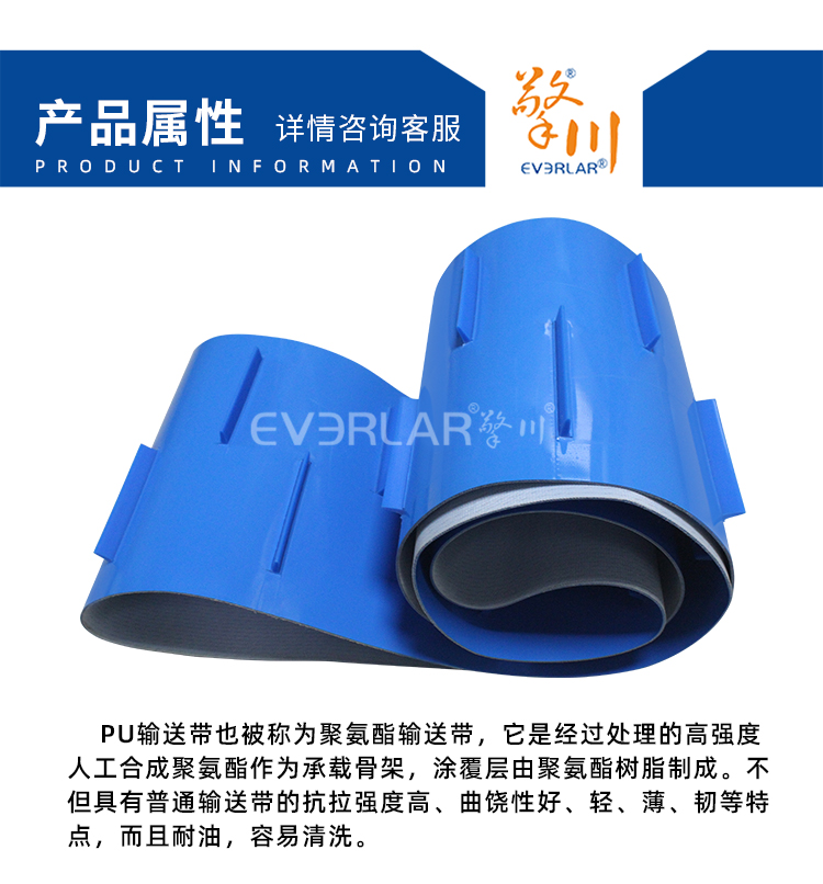 • 產品名稱:藍色PU輸送帶加擋塊耐磨耐油耐腐蝕工業皮帶