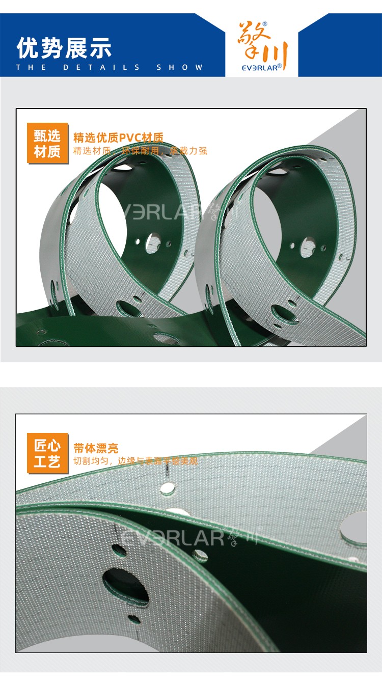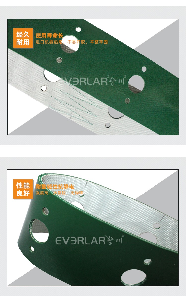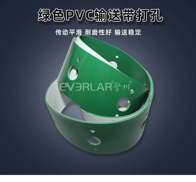 • 產品名稱:綠色PVC輸送帶加打孔耐磨耐腐蝕防靜電工業皮帶定制