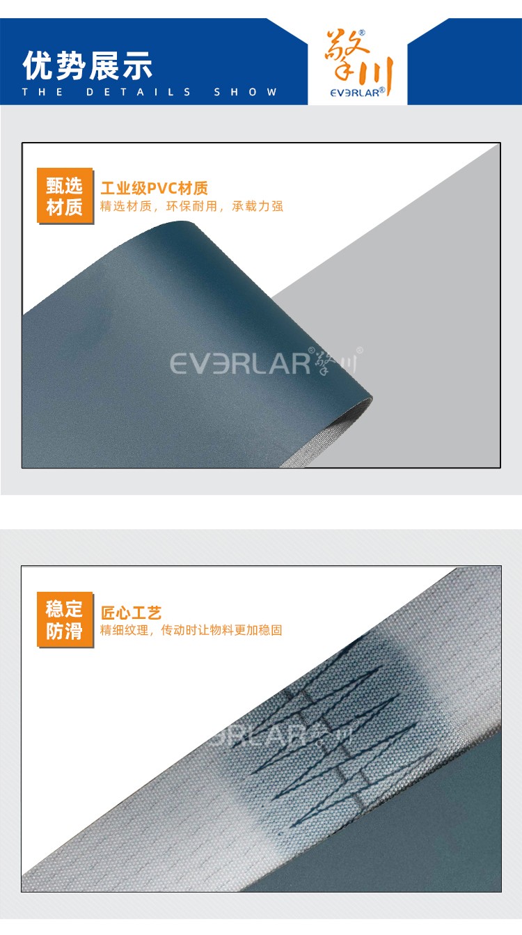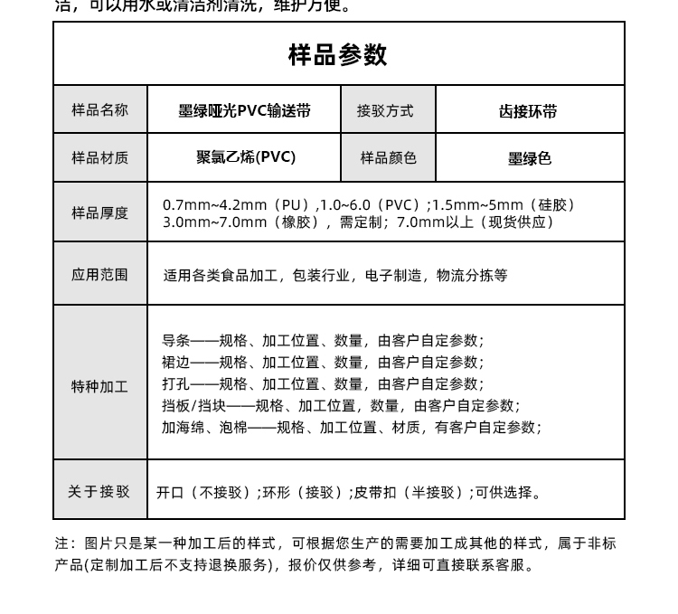 • 產品名稱:墨綠啞光PVC輸送帶耐腐蝕防滑易清潔工業皮帶定制