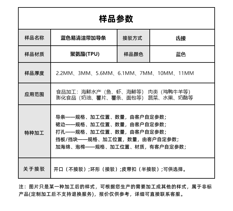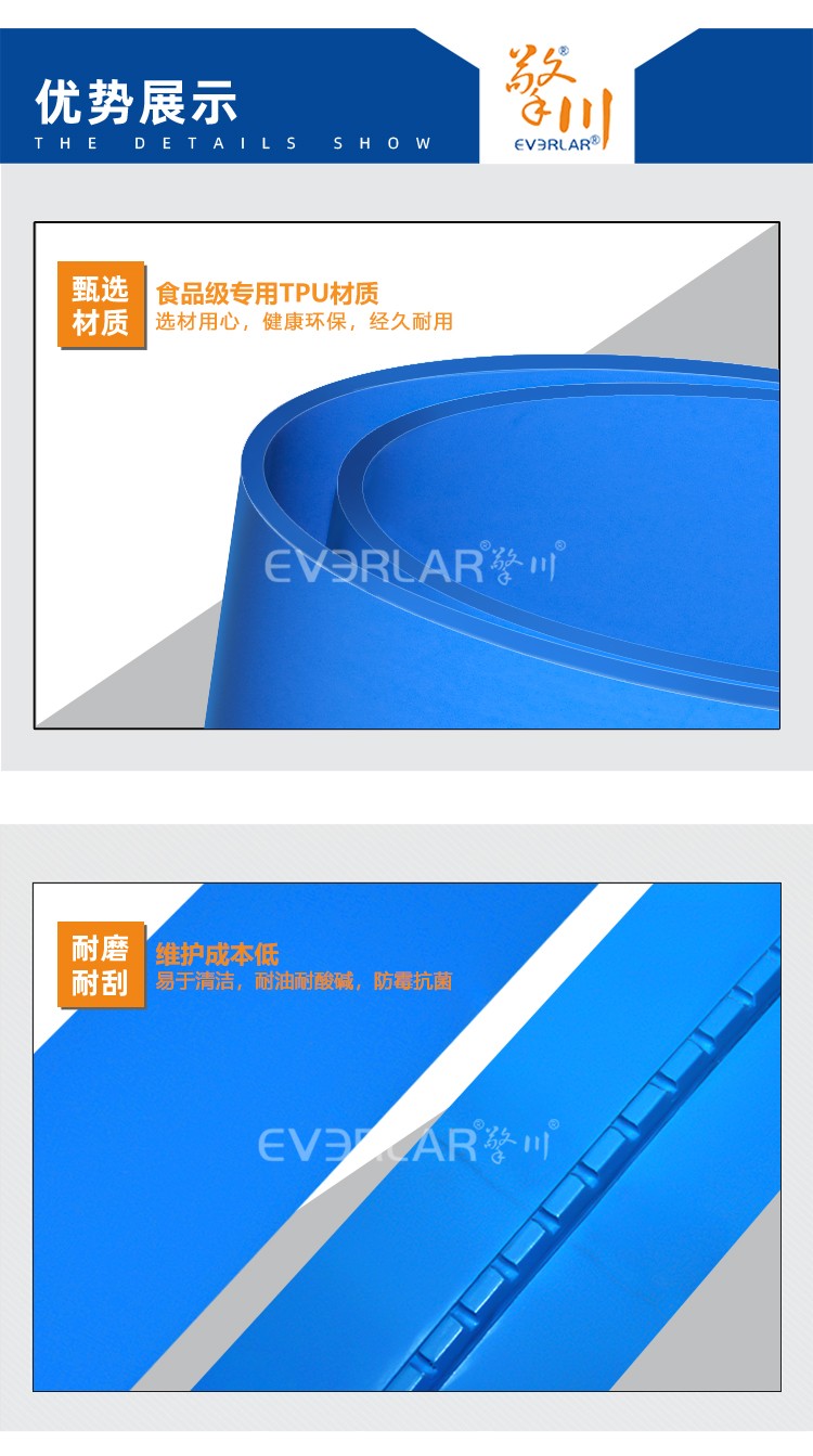 產(chǎn)品名稱(chēng):易清潔TPU輸送帶加導(dǎo)條精準(zhǔn)定位藍(lán)色食品級(jí)傳送帶廠家定制