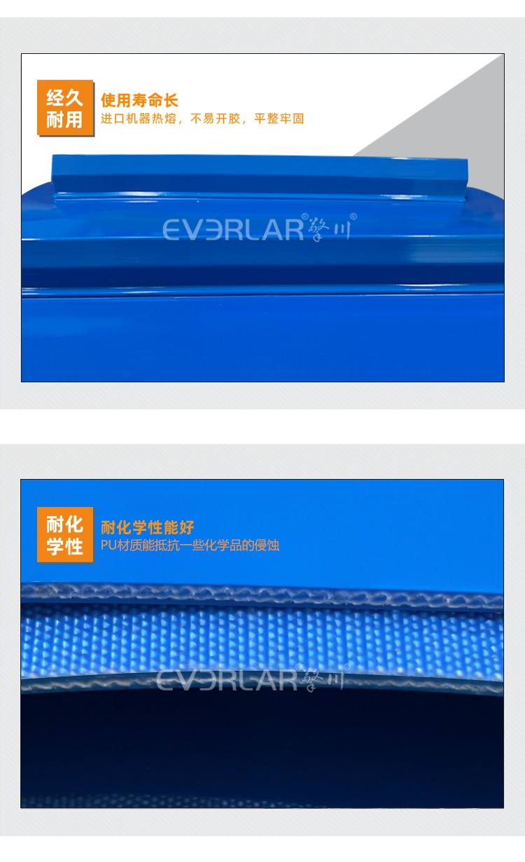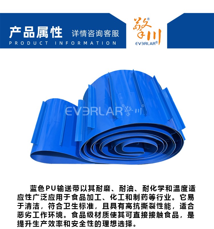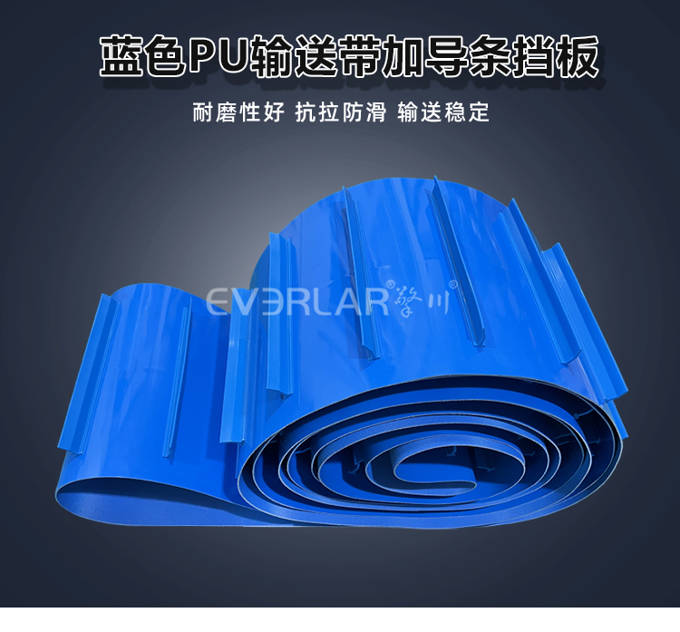 • 產品名稱:PU輸送帶加擋板導條耐磨防滑藍色食品級自動化流水線傳送帶定制