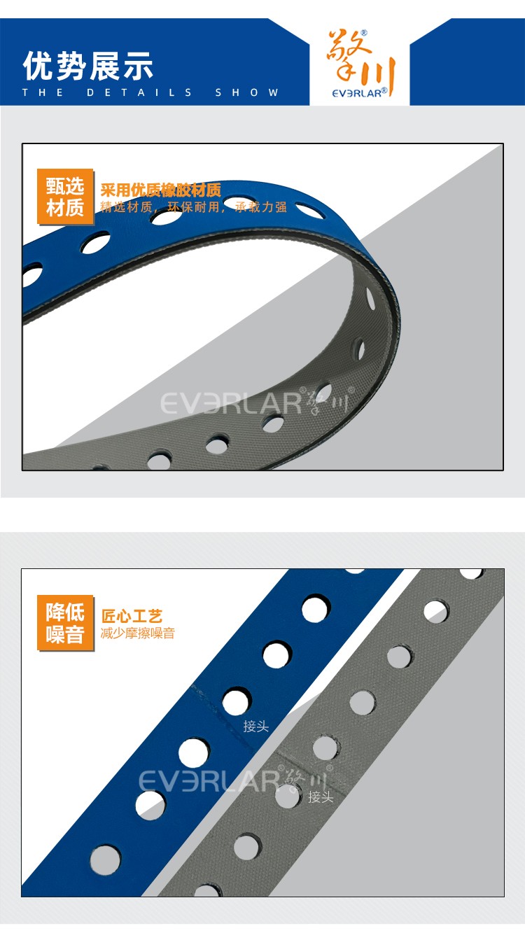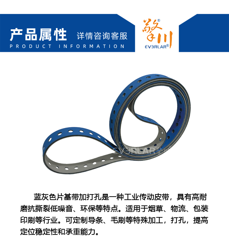 產(chǎn)品名稱:藍(lán)灰片基帶加打孔耐磨抗拉伸印刷紡織生產(chǎn)線紙張布料元件傳送平皮帶