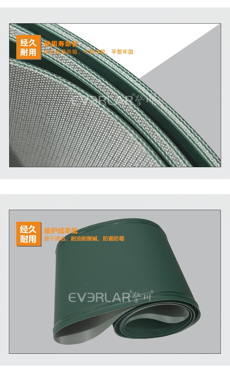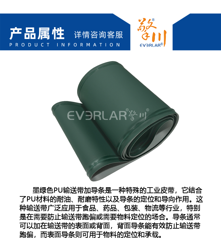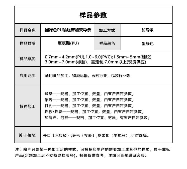 • 產品名稱:墨綠色PU輸送帶加雙導條耐磨抗撕裂食品電子物流分揀機皮帶擎川定制