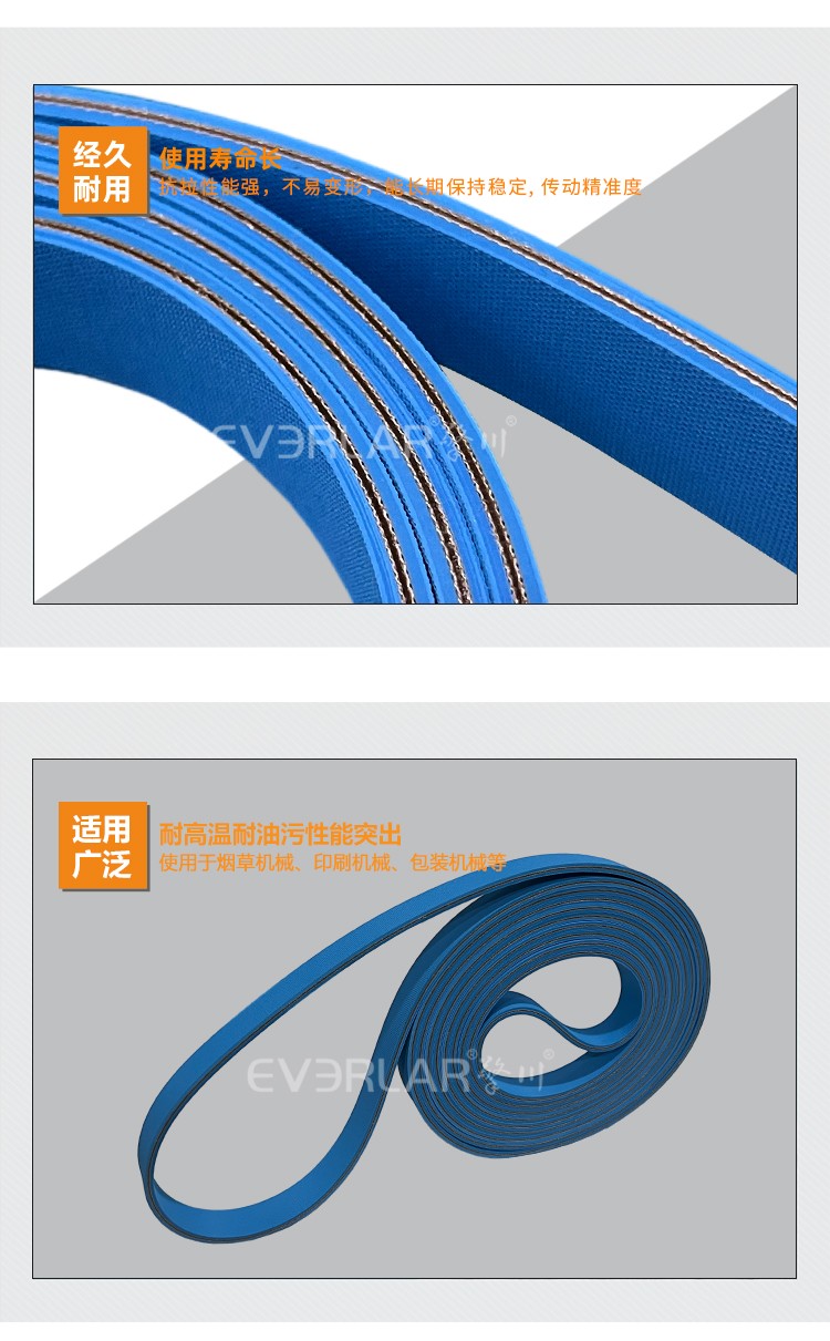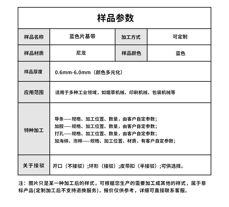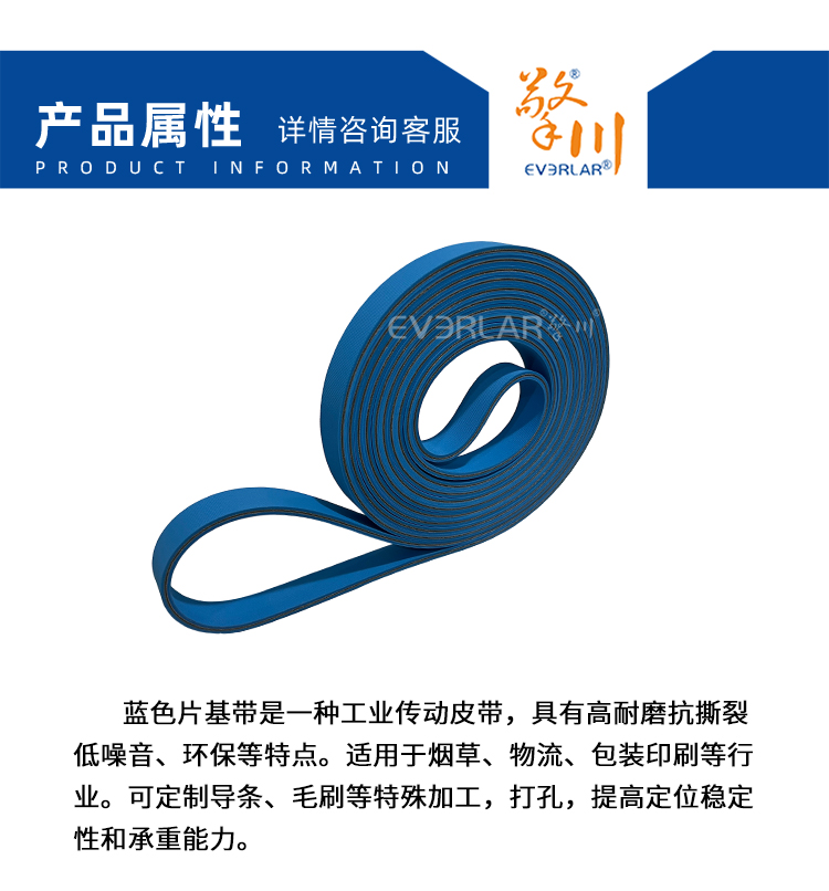• 產品名稱:藍色尼龍片基帶低噪音防滑物流包裝行業折盒機傳動帶廠家直供