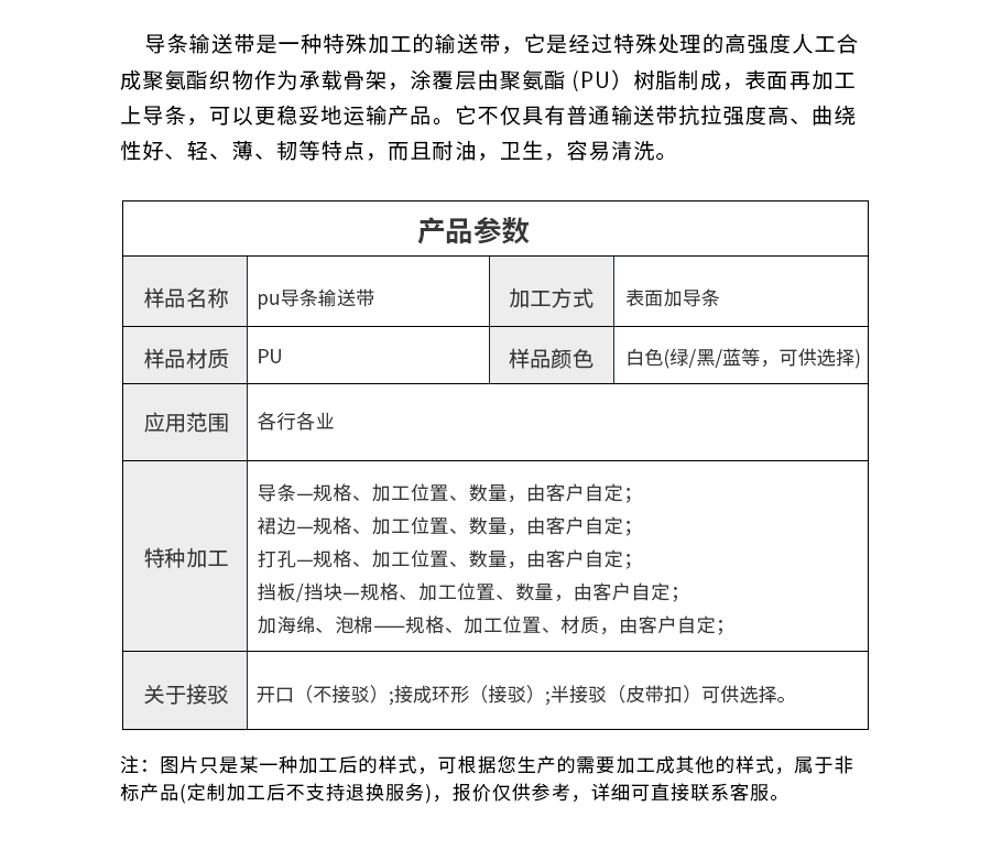 備注:PU月餅輸送帶圖片只是某一種加工后的樣式,可根據(jù)您生產(chǎn)的需要加工成其他的樣式,屬于非標產(chǎn)品(定制加工后不支持退換服務),報價僅供參考,詳細可直接聯(lián)系客服。