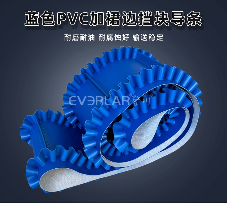 為食品、醫(yī)藥、包裝、日化提供一站式特殊定制PVC輸送帶:藍(lán)色 PVC 輸送帶加裙邊擋板導(dǎo)條的衛(wèi)生與高效輸送